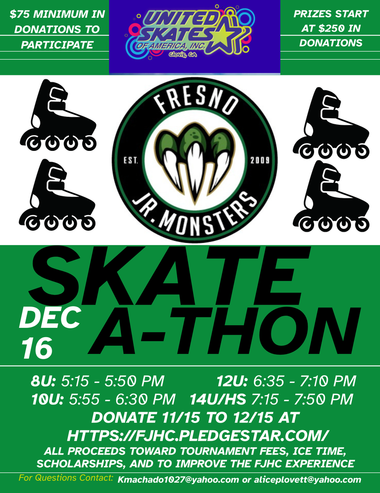 Saturday, November 15, marks the beginning of our first annual FJHC skate-a-thon! Donations will be accepted through December 15th. I’m sure many of you are familiar with the ever popular school jog-a-thon fundraisers. We are doing the same thing but hockey style! All donations will be used for individual team tournament fees, ice time, and scholarships and a means to improve the overall FJHC experience for all.