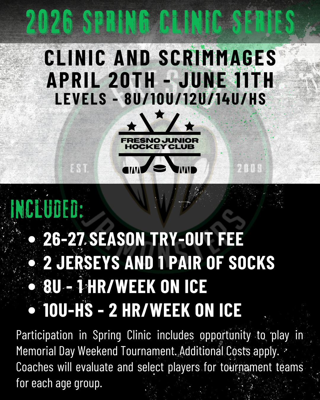 Participation is Spring Clinic includes the opportunity to play on a Memorial Day Weekend Tournament team. Additional Costs apply. Coaches will evaluate and select players for the tournament team for each age group.